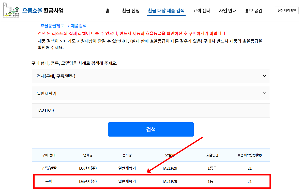 2-1. 제가 구입하려는 LG세탁기의 검색결과를 확인해 보니 '환급대상 제품'이라는 걸 확인할 수 있었습니다. 여러분도 미리 확인해 둔 으뜸효율 가전제품이 있다면 구입 전 환급 대상 제품인지를 꼭 확인하여 환급을 받으시길 바랍니다.