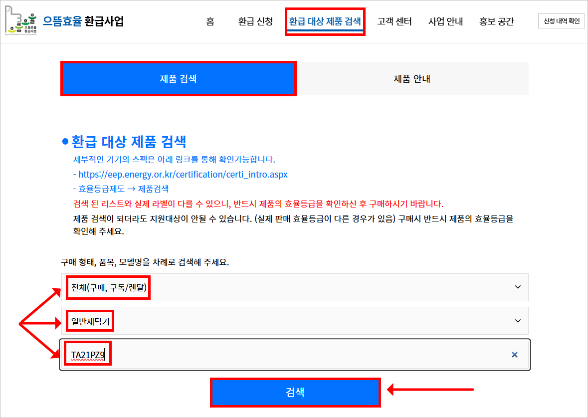 으뜸효율 가전제품 환급 대상 여부 확인을 위한 모델명 검색방법